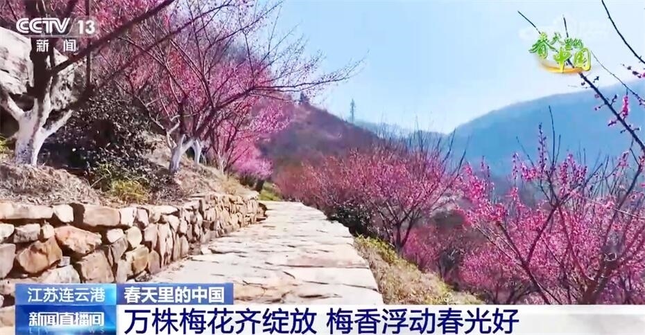 春日暖陽中,江蘇連云港花果山漫山遍野的梅花悄然綻放,紅梅花開似海、明媚驚艷,遠看如云霞燦爛,近聞有盈袖暗香?;ü矫穲@經過多年的栽植培育,有紅梅、美人梅、綠萼梅等梅樹2萬多株。