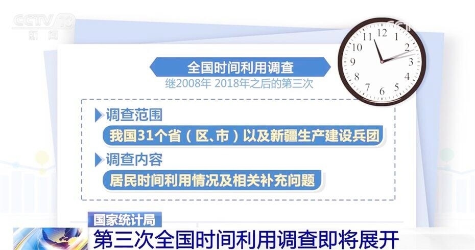 此次全國時(shí)間利用調(diào)查是繼2008年、2018年之后的第三次,調(diào)查范圍包括我國31個(gè)?。▍^(qū)、市)以及新疆生產(chǎn)建設(shè)兵團(tuán),調(diào)查的內(nèi)容為居民時(shí)間利用情況及相關(guān)補(bǔ)充問題。