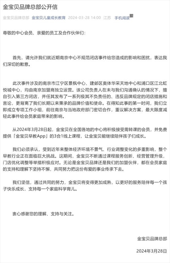 ·連鎖早教機(jī)構(gòu)金寶貝多地門店停業(yè),家長遭遇退款難,金寶貝總部回應(yīng)致歉。