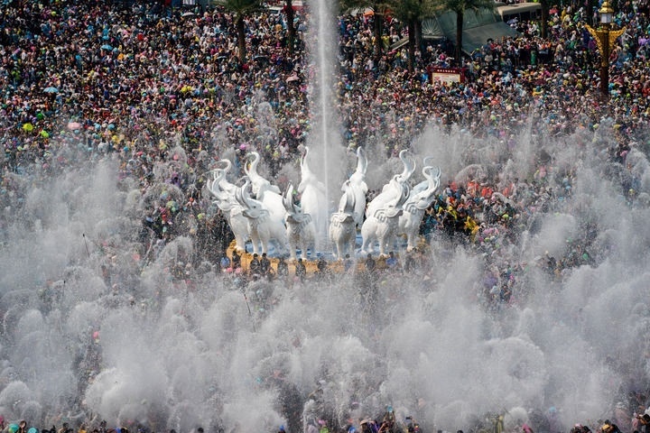 ?人們?cè)谠颇鲜∥麟p版納傣族自治州景洪市潑水廣場(chǎng)潑水狂歡(2023年4月15日攝)。除署名外組圖均由新華社記者 胡超 攝