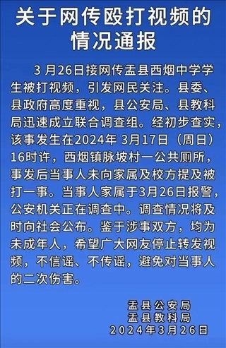 ·官方通報“山西盂縣一學(xué)生在公廁內(nèi)被打”:公安機關(guān)介入調(diào)查。