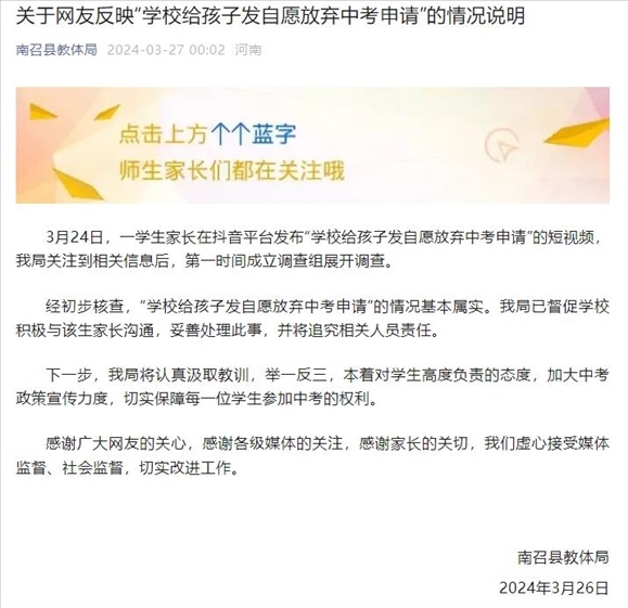 ·網(wǎng)傳河南一學(xué)校勸學(xué)生自愿放棄中考,縣教體局:基本屬實,將追責(zé)。