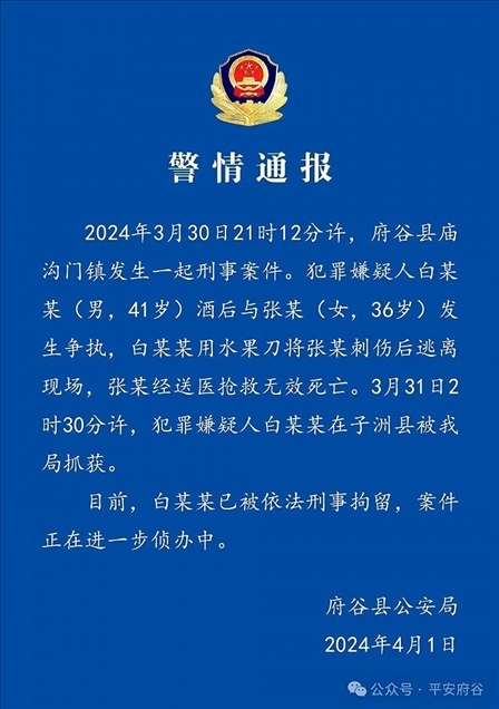 ·陜西府谷警方通報“男子將女子刺傷致死”:嫌犯已被刑拘。