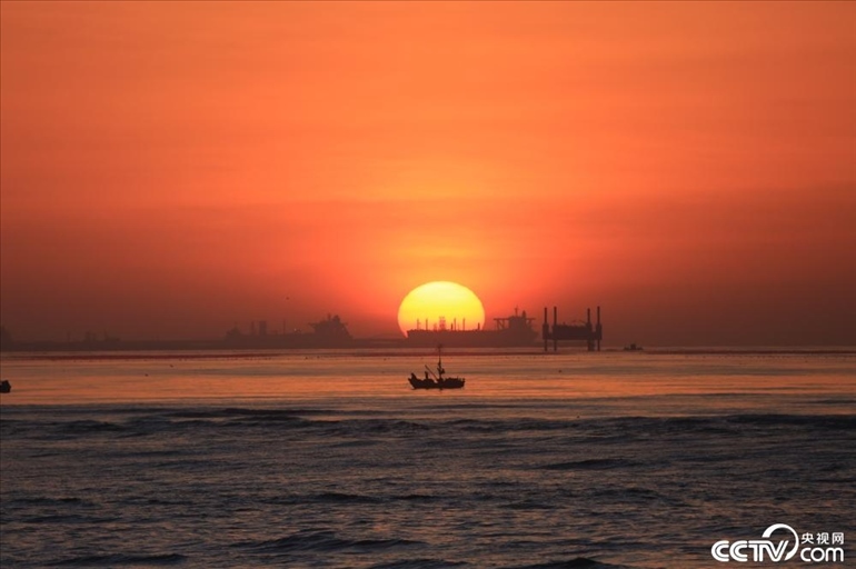 近日,山東省日照市,一輪紅日從海平面緩緩升起,遠處的遠洋巨輪、早起捕魚的漁船與紅日相互映襯,構(gòu)成了一幅唯美的春天海上日出畫卷。?