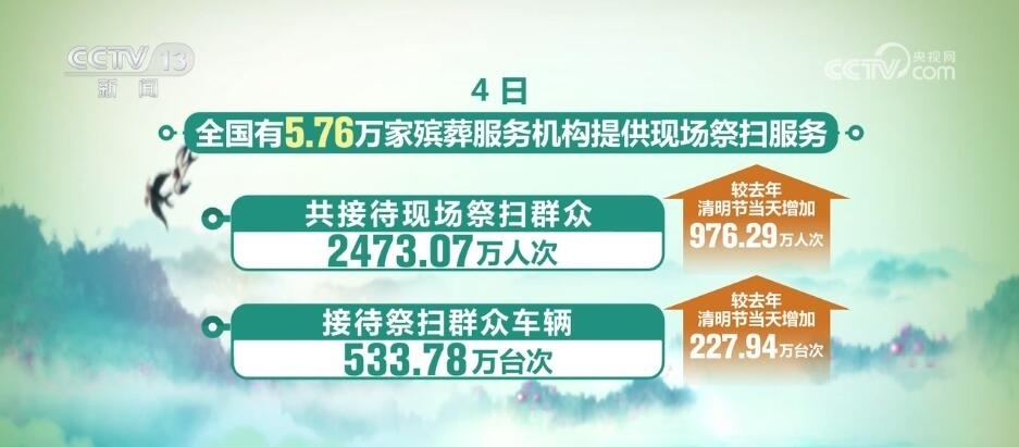 4日,全國(guó)有5.76萬(wàn)家殯葬服務(wù)機(jī)構(gòu)提供現(xiàn)場(chǎng)祭掃服務(wù),共接待現(xiàn)場(chǎng)祭掃群眾2473.07萬(wàn)人次,接待祭掃群眾車輛533.78萬(wàn)臺(tái)次,較去年清明節(jié)當(dāng)天分別增加976.29萬(wàn)人次和227.94萬(wàn)臺(tái)次,其中選擇綠色低碳祭掃方式的群眾1712.97萬(wàn)人次,占現(xiàn)場(chǎng)祭掃總?cè)藬?shù)的69.26%。