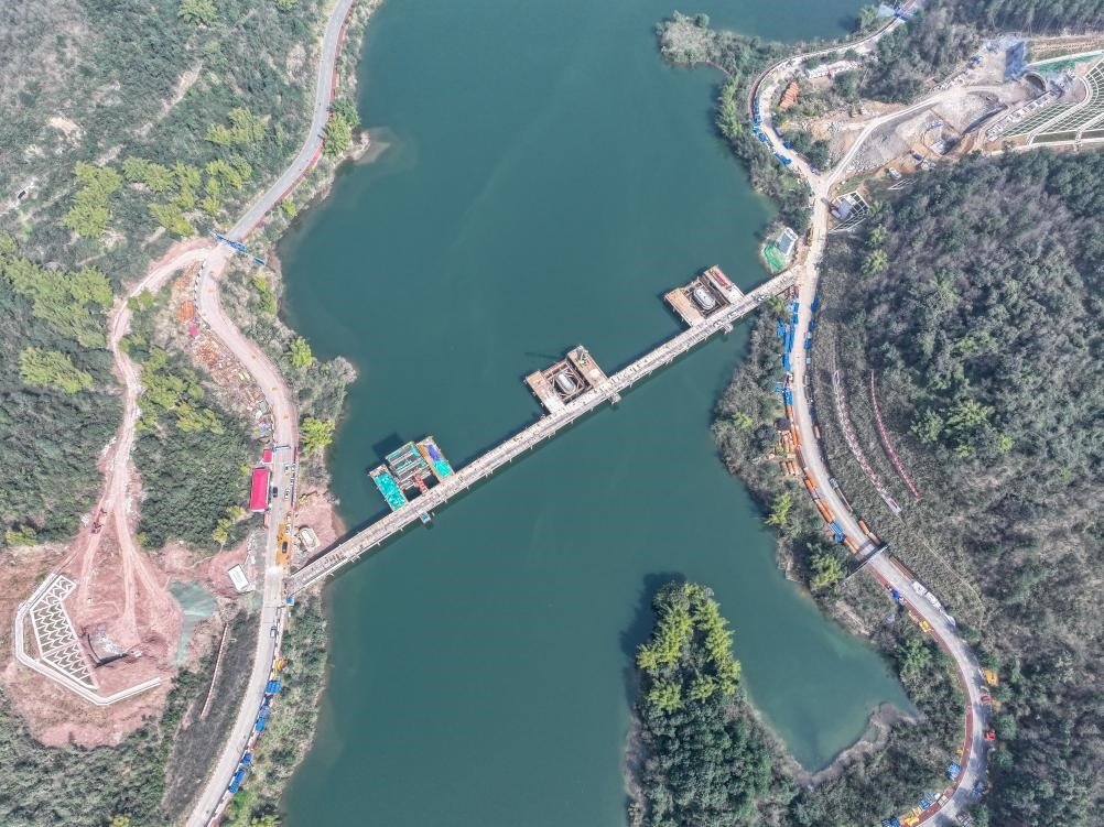 這是2月19日拍攝的位于重慶市銅梁區(qū)的成渝中線高鐵玄天湖大橋建設(shè)現(xiàn)場(chǎng)(無人機(jī)照片)。新華社記者 唐奕 攝
