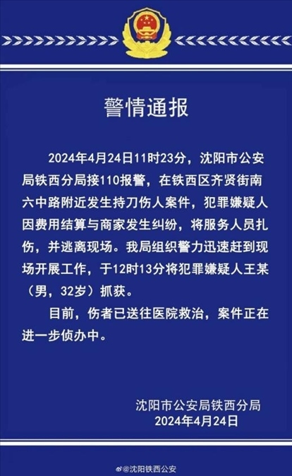 ·沈陽鐵西區(qū)發(fā)生一起持刀傷人案,犯罪嫌疑人已被抓獲。