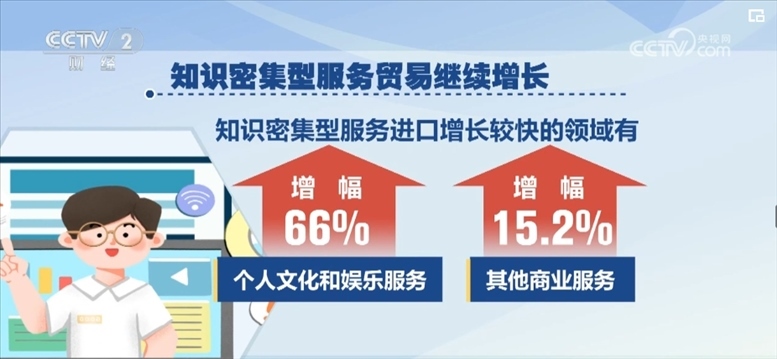 知識密集型服務貿易繼續(xù)增長。2024年一季度,知識密集型服務進出口7332.6億元,增長5.6%。其中知識密集型服務出口增長較快的領域有知識產權使用費、個人文化和娛樂服務,增幅分別為34.4%、19%;知識密集型服務進口增長較快的領域有個人文化和娛樂服務、其他商業(yè)服務,增幅分別為66%、15.2%。