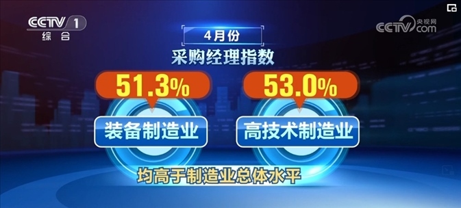 新動能繼續(xù)較快擴張。4月份,裝備制造業(yè)和高技術制造業(yè)采購經理指數分別為51.3%和53.0%,均高于制造業(yè)總體水平。