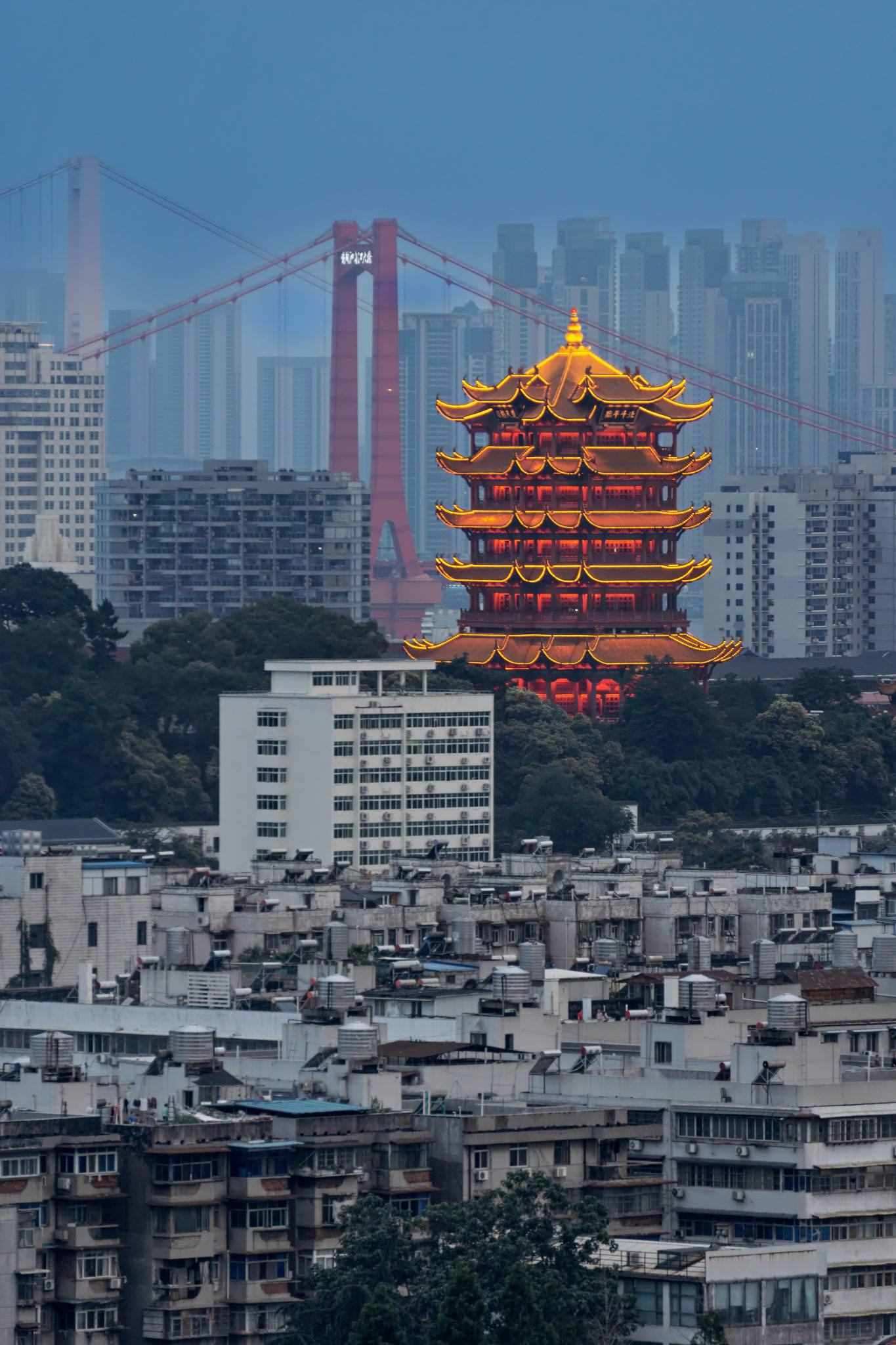 武漢:黃鶴樓與鸚鵡洲大橋同框 2023年6月8日,武漢,黃鶴樓與鸚鵡洲大橋同框。......
