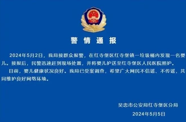 ·寧夏吳忠一垃圾桶內(nèi)發(fā)現(xiàn)棄嬰,警方通報:已受案調(diào)查。