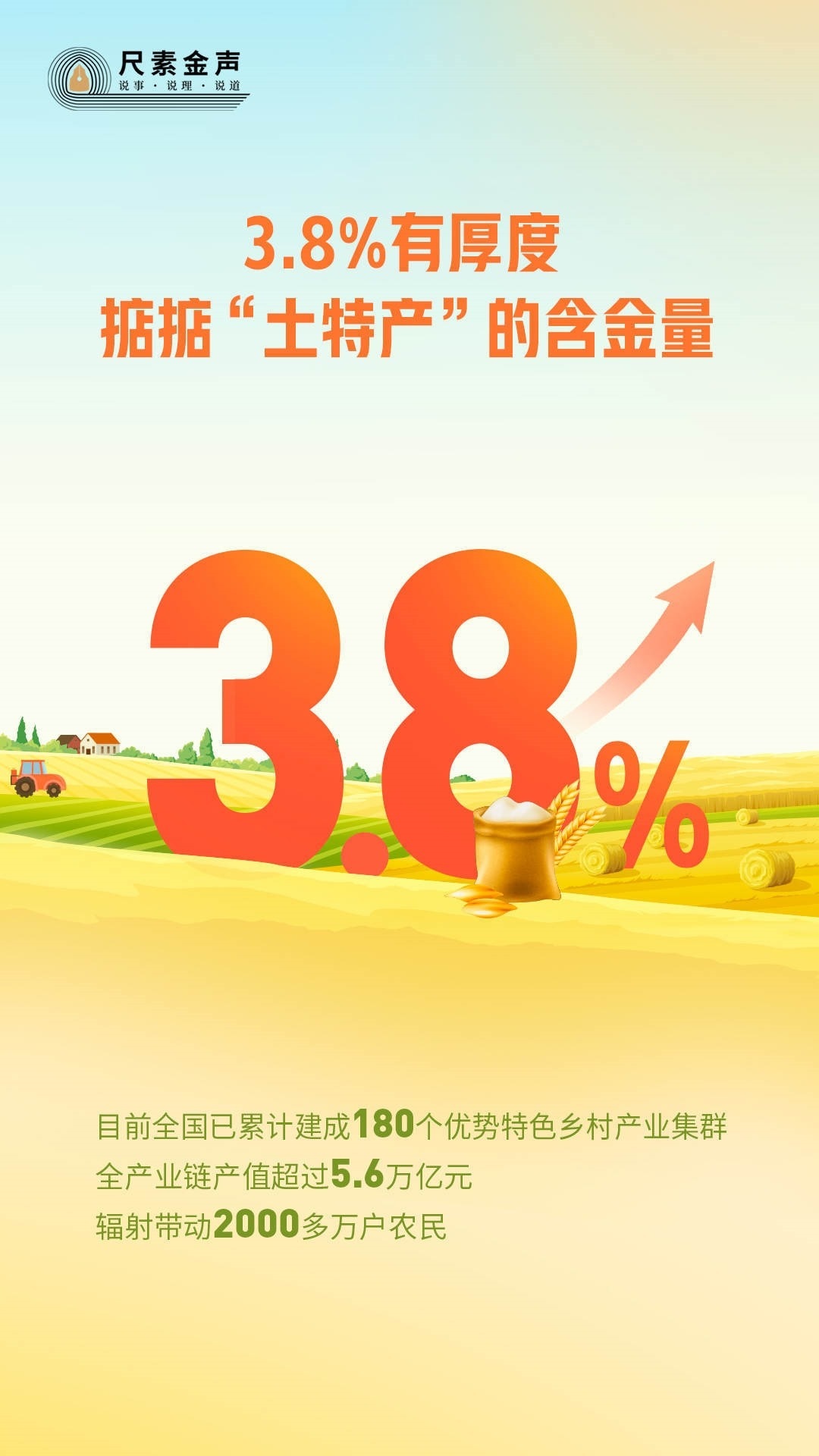 透過(guò)這3.8%,我們還可以看到現(xiàn)代化大農(nóng)業(yè)發(fā)展的廣闊前景。在廣西柳州,一碗螺螄粉“嗦”出一個(gè)大產(chǎn)業(yè),從原材料種養(yǎng)殖,到食品制作加工,再到產(chǎn)品流通銷售,螺螄粉產(chǎn)業(yè)帶動(dòng)66萬(wàn)畝原材料基地,創(chuàng)造30多萬(wàn)個(gè)就業(yè)崗位,去年全產(chǎn)業(yè)鏈銷售收入為669.9億元。贛南臍橙、延安蘋果、橫州茉莉花、文登西洋參……一個(gè)個(gè)土特產(chǎn),延展出一條條產(chǎn)業(yè)鏈,支撐起一個(gè)個(gè)優(yōu)勢(shì)特色產(chǎn)業(yè)集群。目前全國(guó)已累計(jì)建成180個(gè)優(yōu)勢(shì)特色鄉(xiāng)村產(chǎn)業(yè)集群,全產(chǎn)業(yè)鏈產(chǎn)值超過(guò)5.6萬(wàn)億元,輻射帶動(dòng)2000多萬(wàn)戶農(nóng)民。