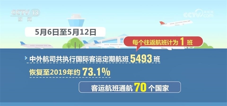 中國民航局數(shù)據(jù)顯示,5月6日至5月12日,中外航司共執(zhí)行國際客運定期航班5493班(每個往返航班計為1班),恢復(fù)至2019年約73.1%,客運航班通航70個國家。