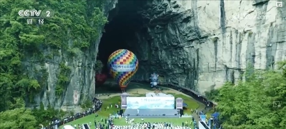 在湖北利川騰龍景區(qū),穿著絢麗多彩的土家族服裝的阿哥阿妹,在億萬年前形成的天然溶洞前翩翩起舞、擊鼓迎賓。