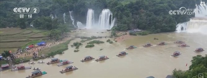 水量大增的瀑布奔騰而下沖擊著河面水聲轟鳴,慕名前來的游客們或乘坐竹筏感受瀑布的恢弘氣勢,或?qū)ふ易罴褭C位與瀑布“打卡”合影。除了近距離觀賞德天跨國瀑布,也有不少游客選擇跨境游玩,站在越南境內(nèi)的板約瀑布看德天瀑布,以不同視角體驗中越風情。
