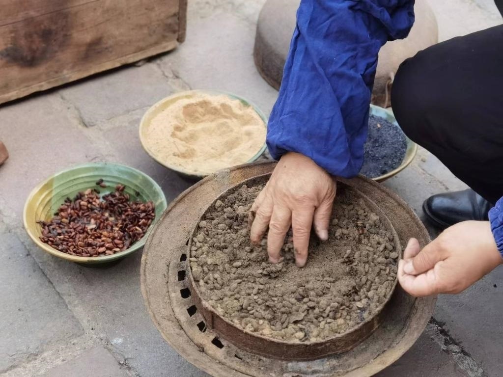 沖好針孔,便在磨石上反復(fù)銼尖。隨后倒入熱鍋里翻炒,再舀入一瓢水,針的剛性和硬度由此增加。接下來便輪到三大碗“大陽秘方”登場(chǎng):白崖土粉末、松木炭和發(fā)酵后的豆豉,用于蒸針?!八赡咎靠梢栽黾愉撫樀暮剂?,提升硬度;豆豉增加亮度;白崖土粉末作為分散劑讓針受熱均勻。這樣處理后可以保證針質(zhì)更堅(jiān)硬又有光澤。”