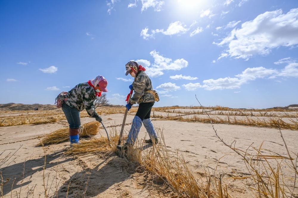 ?2024年3月28日,在內(nèi)蒙古通遼市科爾沁左翼后旗阿古拉鎮(zhèn),治沙工人在科爾沁沙地里打草方格。新華社記者 連振 攝