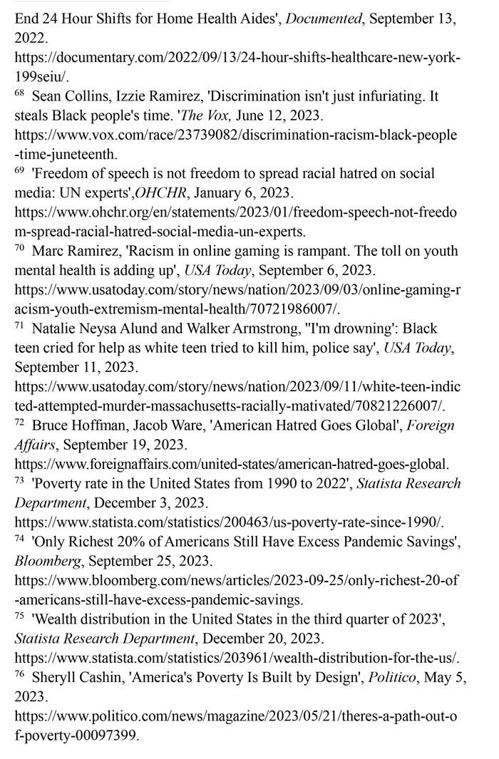 少數族裔遭遇職場歧視。美國一家名為“溫室”的招聘軟件公司發(fā)布的《2023年求職者面試經歷報告》顯示,招聘過程中的歧視現象“相當令人擔憂”。34%的求職者在面試中遇到過歧視性問題,近1/5的求職者曾試圖通過在簡歷中更改姓名,以避免受歧視性招聘行為的影響。在改名的求職者中,有45%是為了讓自己聽起來“不那么有族裔特點”。(注65)英國《衛(wèi)報》網站2023年4月23日披露,美國政府數十年來刻意逃避勞工保護責任,壓榨少數族裔勞工。紐約的有色族裔護工不僅被迫接受連續(xù)長時間的工作,薪資還受到克扣。不少護工因此罹患失眠、慢性病等疾病,對護工及其家庭造成嚴重傷害。(注66)少數族裔勞工一直嘗試通過各種渠道爭取權利保障,但在一些利益集團阻礙下成效寥寥。(注67)沃克斯新聞網2023年6月12日報道,在美國,非洲裔一直比白人掙得少。這種差異意味著在種族歧視的影響下,非洲裔時間價值明顯低于白人,為了彌補歧視造成的工資差距,非洲裔工人每天必須多工作2.7小時。(注68)