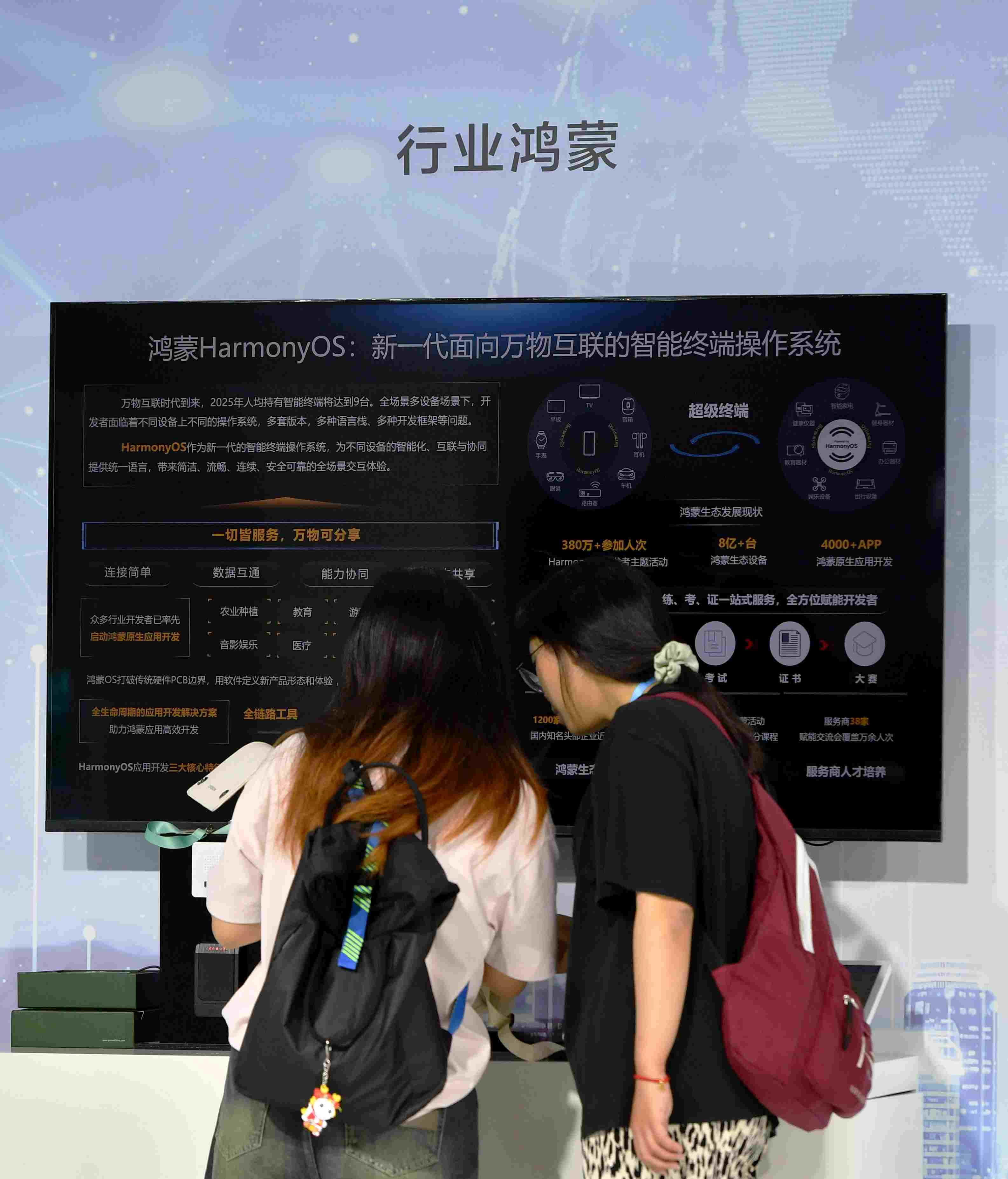 在現(xiàn)場體驗區(qū),兩名觀眾在體驗鴻蒙智能終端系統(tǒng)。新華社記者魏培全 攝