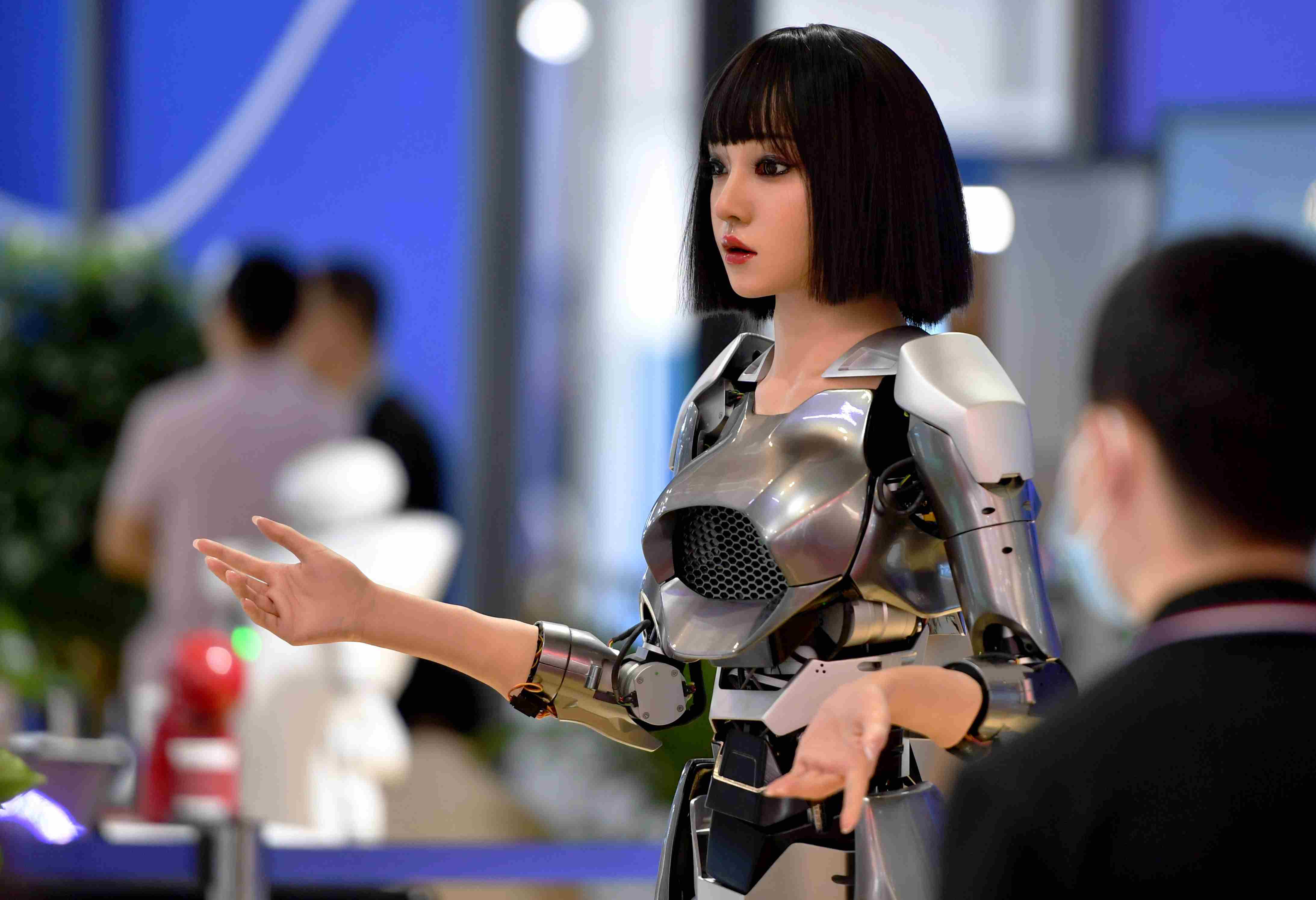 在現(xiàn)場體驗區(qū),超仿生人形機器人“小柒”在向觀眾致意。 新華社記者魏培全 攝
