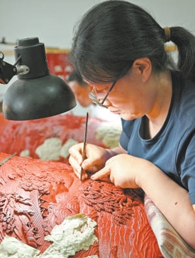 文化傳承揚(yáng)州漆器技藝傳承人進(jìn)行雕花。本報(bào)記者 雷 聲攝