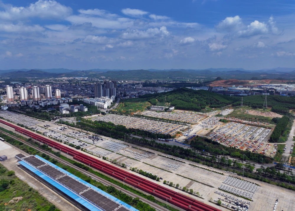 汽車在廣西柳州雒容汽車物流基地等待進(jìn)入鐵路貨車車廂。部分出口的新能源汽車從這里裝車運(yùn)往各大出海港口(2024年5月24日攝,無人機(jī)照片)。