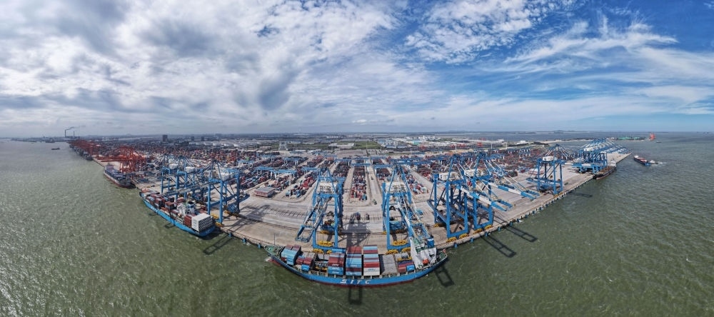 2024年6月13日,途經(jīng)馬來西亞關(guān)丹港的“海豐博多”輪在廣西欽州港集裝箱裝卸自動(dòng)化碼頭進(jìn)行裝卸作業(yè)(無人機(jī)全景照片)。