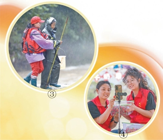 圖③:安徽省歙縣山越救援隊(duì)黨員(左)在轉(zhuǎn)移受災(zāi)群眾。樊成柱攝(影像中國(guó)) 圖④:新疆維吾爾自治區(qū)烏蘇市黨員志愿者到田間地頭直播銷(xiāo)售草莓。李仁錫攝(影像中國(guó))