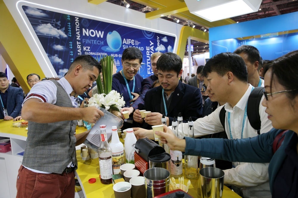 2019年11月6日,在上海進(jìn)博會(huì)哈薩克斯坦國(guó)家館,調(diào)酒師為參觀者分享雞尾酒。
