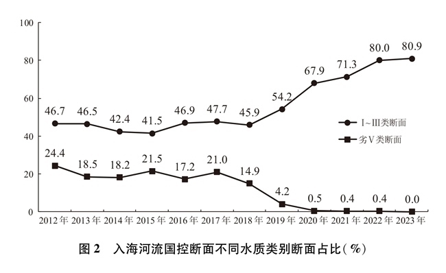 抓好入海河流污染防治。入海河流是陸源污染物輸入海洋的最重要途徑。中國(guó)積極提升城鎮(zhèn)污水處理質(zhì)效,建設(shè)改造雨污分流管網(wǎng),加強(qiáng)污水處理行業(yè)監(jiān)管,降低城鎮(zhèn)生產(chǎn)生活污水對(duì)入海河流水質(zhì)影響。2012年以來(lái),沿海地區(qū)污水處理基礎(chǔ)設(shè)施建設(shè)顯著提速,地級(jí)以上城市污水處理廠基本完成一級(jí)A提標(biāo)改造。開(kāi)展農(nóng)村環(huán)境整治,“十四五”以來(lái),沿海省份新增完成1.7萬(wàn)個(gè)行政村環(huán)境綜合整治,編制完成170個(gè)畜牧大縣畜禽養(yǎng)殖污染防治規(guī)劃,農(nóng)村生活污水治理率超過(guò)45%,大幅降低農(nóng)業(yè)農(nóng)村污水排放。著力破解流域氮排放過(guò)量的近岸海域水質(zhì)污染和富營(yíng)養(yǎng)化問(wèn)題,建立沿海、流域、海域協(xié)同一體的綜合治理體系,探索將總氮控制范圍向入海河流上游拓展,推動(dòng)入海河流實(shí)施“一河一策”總氮治理。2012-2017年中國(guó)入海河流國(guó)控?cái)嗝嫠|(zhì)整體保持穩(wěn)定并有所好轉(zhuǎn),2018年以后水質(zhì)整體大幅好轉(zhuǎn)。目前,入海河流國(guó)控?cái)嗝嫠|(zhì)優(yōu)良(Ⅰ~Ⅲ類(lèi))斷面數(shù)量約占整體的五分之四左右,喪失使用功能(劣Ⅴ類(lèi))斷面基本消除。