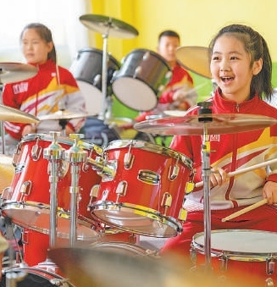 黑龍江省安達市任民鎮(zhèn)中心小學,學生們在教室練習架子鼓。新華社記者 謝劍飛攝