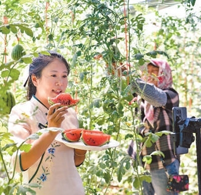 山東省濱州市濱城區(qū)一家生態(tài)園的西瓜大棚內,主播正在直播帶貨。新華社記者 郭緒雷攝