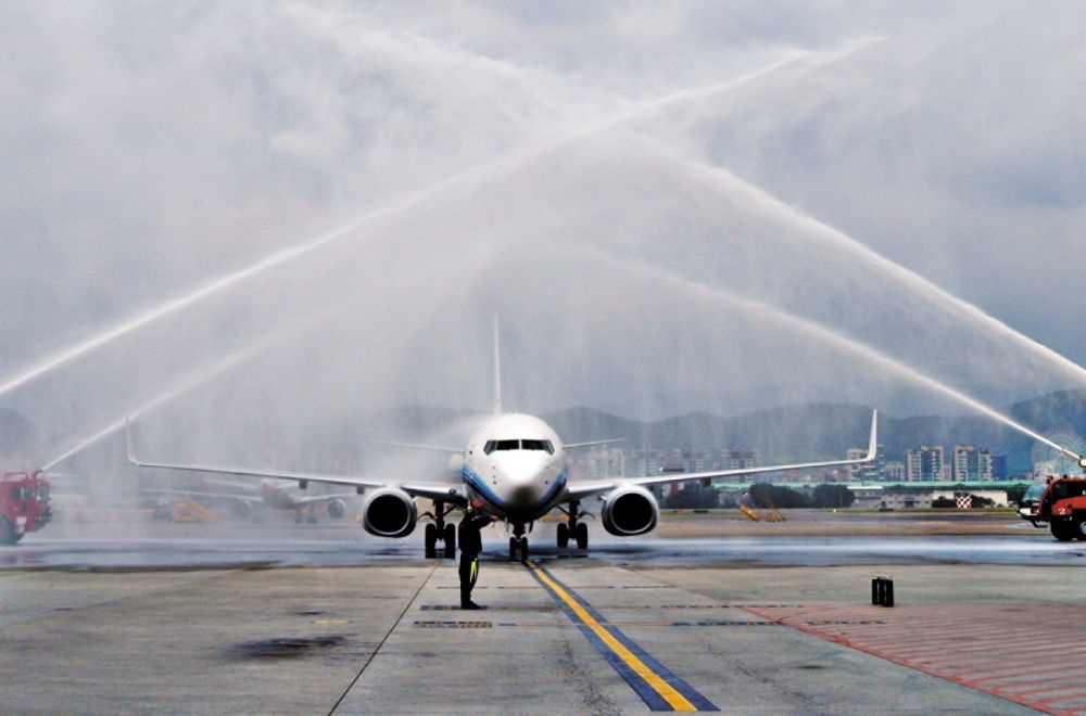 2008年,兩岸“三通”啟動常態(tài)包機(jī),廈航成為廈門、福州和杭州航點的運營航空公司。這是2008年12月15日,臺北松山機(jī)場以“水門”儀式迎接廈航常態(tài)化包機(jī)。