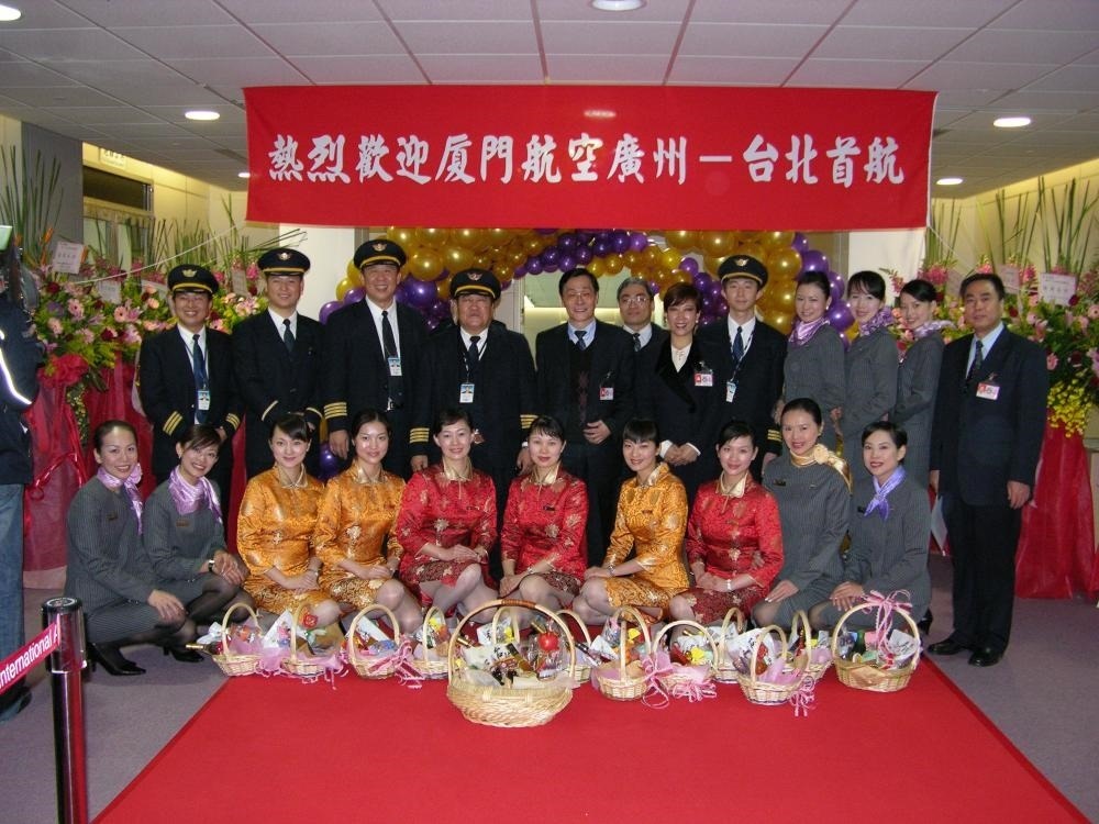 2005年,海峽兩岸首次開放春節(jié)包機(jī)。這是2005年1月29日,廈航作為大陸6家參與臺商春節(jié)包機(jī)直航的航空公司之一,圓滿完成了廣州-臺北往返包機(jī)任務(wù)。這是廈航首航臺北機(jī)組成員在臺北與迎接人員親切合影。