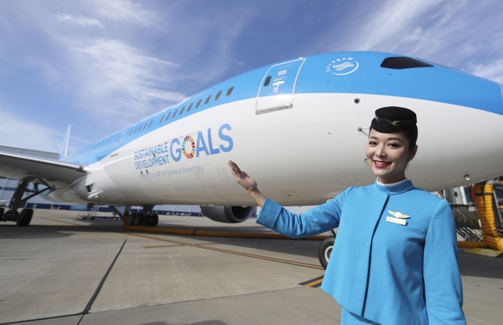 2018年1月26日,在美國查爾斯頓波音工廠,中國廈門航空公司的一名空乘人員展示廈航首架涂裝宣傳聯(lián)合國可持續(xù)發(fā)展目標(biāo)的客機(jī)。新華社記者 王迎 攝