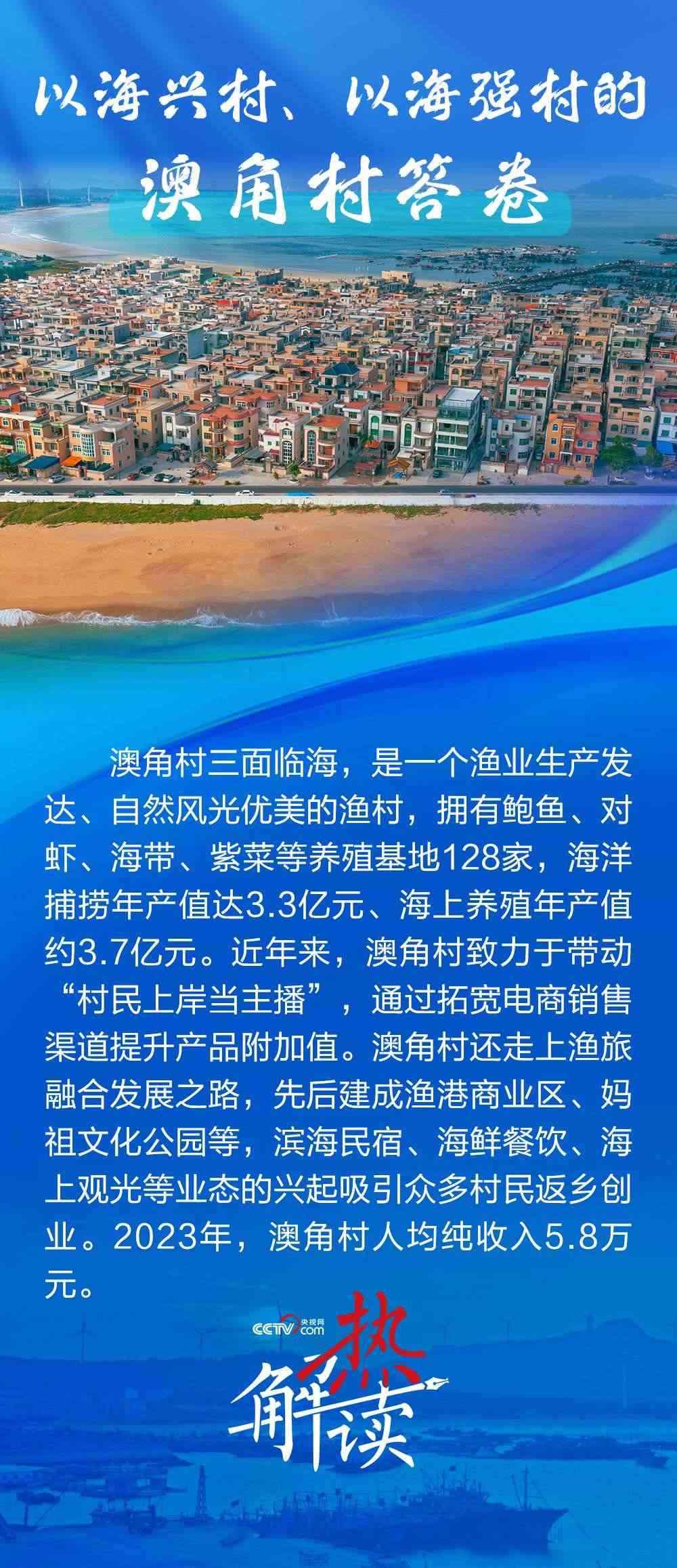 澳角村三面臨海,近年來走出了一條以海興村、以海強村的新路子。看到鄉(xiāng)村發(fā)生了巨變,總書記直言“鄉(xiāng)村振興還是要發(fā)揚優(yōu)勢”,并勉勵澳角村做好“?!钡奈恼拢卩l(xiāng)村振興、共同富裕的道路上一往無前。