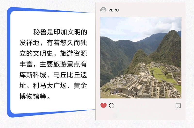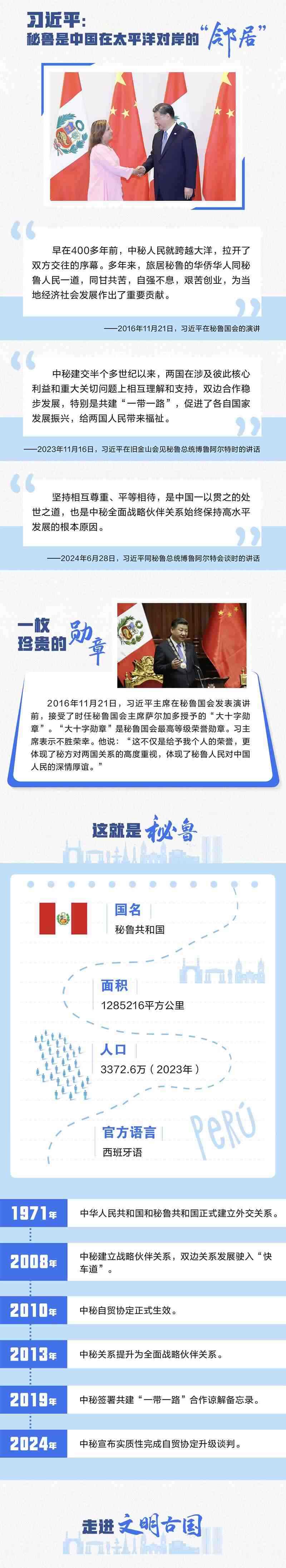 中國(guó)和秘魯都是文明古國(guó),兩國(guó)友誼源遠(yuǎn)流長(zhǎng),人民友好深入人心。習(xí)近平主席曾以“秘魯是中國(guó)在太平洋對(duì)岸的‘鄰居’”形容中秘關(guān)系,生動(dòng)詮釋了兩國(guó)和兩國(guó)人民之間“相知無遠(yuǎn)近”的深厚友誼。