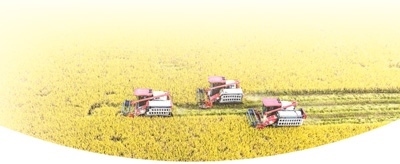湖南省永州市東安縣蘆洪市鎮(zhèn)西江橋村優(yōu)質稻產(chǎn)業(yè)化示范生產(chǎn)基地,專業(yè)收割機正在收割晚稻。蔡小平攝(人民視覺)