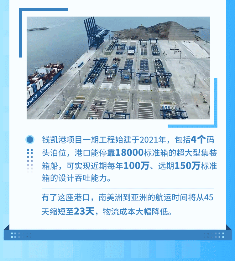 錢凱港位于秘魯首都利馬以北80公里,是中秘共建“一帶一路”重點(diǎn)項(xiàng)目。開港后,中秘間單程海運(yùn)時(shí)間將縮短至23天,節(jié)約20%以上的物流成本,每年將為秘魯創(chuàng)造逾8000個(gè)直接就業(yè)機(jī)會(huì)。