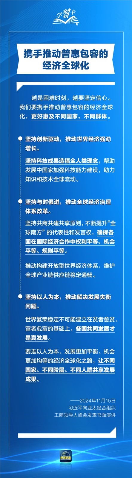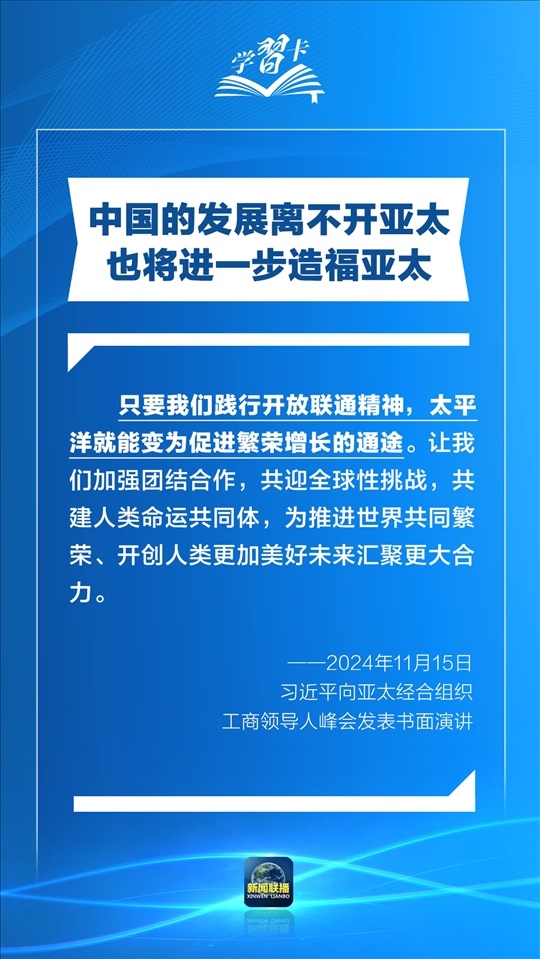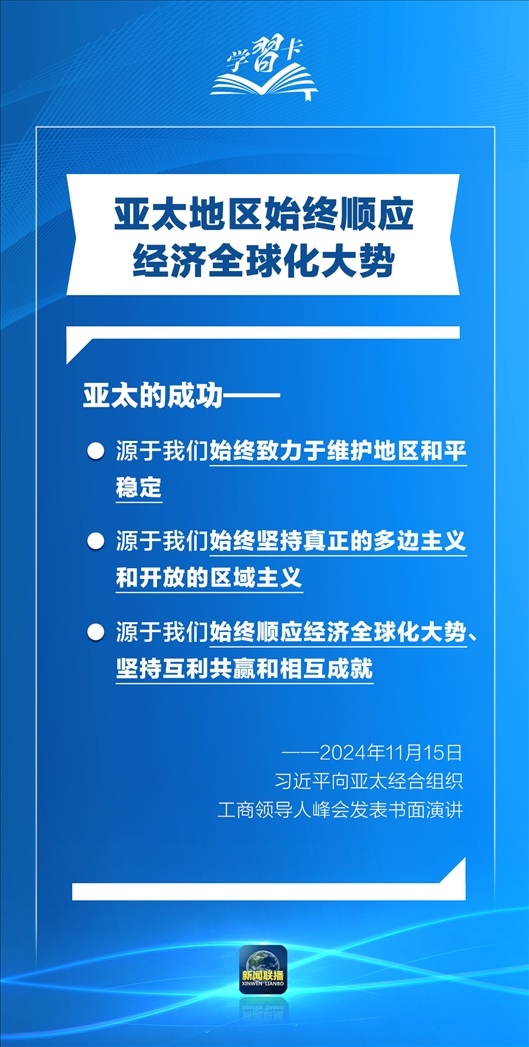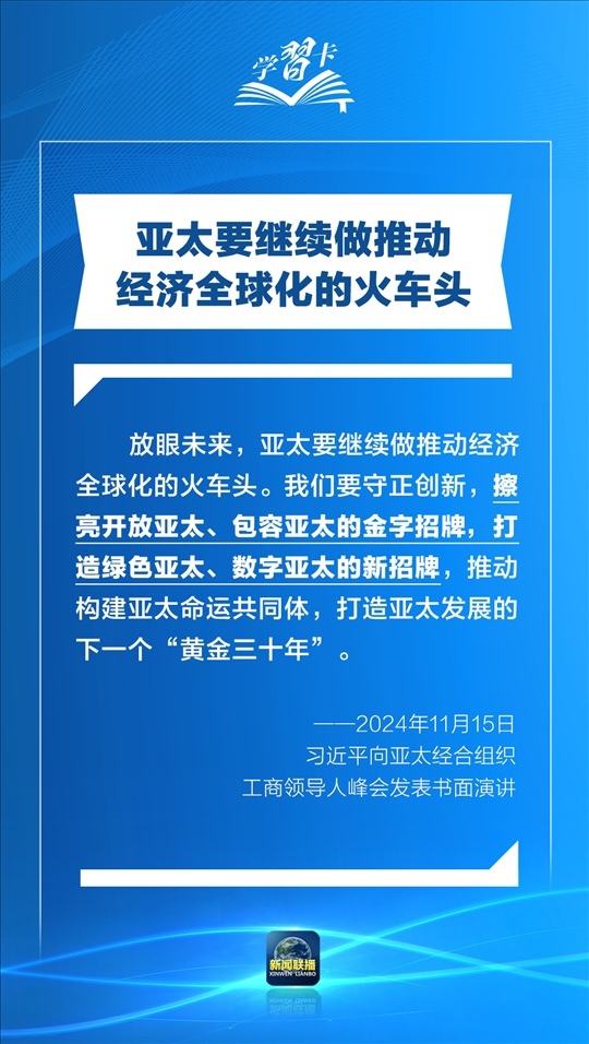 習近平指出,過去30年,亞太地區(qū)經(jīng)濟保持了強勁增長,創(chuàng)造了舉世矚目的“亞太奇跡”。如何推動構(gòu)建亞太命運共同體,打造亞太發(fā)展的下一個“黃金三十年”?習主席強調(diào)了一個關(guān)鍵詞:經(jīng)濟全球化。一起學習↓
