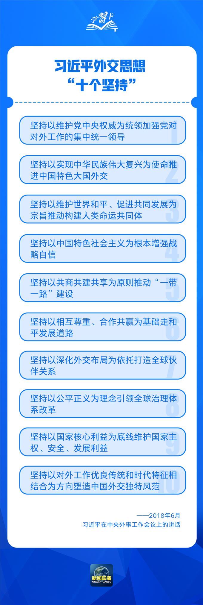 2018年6月召開(kāi)的中央外事工作會(huì)議上,總書(shū)記進(jìn)一步強(qiáng)調(diào),堅(jiān)持以實(shí)現(xiàn)中華民族偉大復(fù)興為使命推進(jìn)中國(guó)特色大國(guó)外交,會(huì)議確立了習(xí)近平外交思想的指導(dǎo)地位。