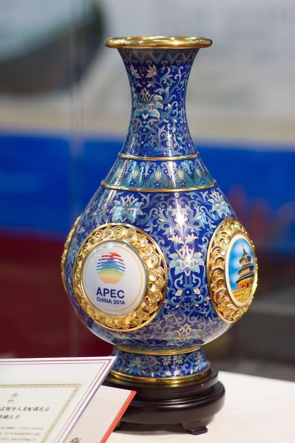 2014年11月,北京APEC會(huì)議在雁棲湖畔舉行。為歡迎參會(huì)的各經(jīng)濟(jì)體領(lǐng)導(dǎo)人,習(xí)近平主席選定了一件國禮——“四海升平”景泰藍(lán)賞瓶。賞瓶的細(xì)節(jié)蘊(yùn)含巧思:瓶高38厘米,是天壇祈年殿38米的等比例縮??;最大直徑21厘米,代表APEC的21個(gè)經(jīng)濟(jì)體。碧藍(lán)的瓶身雕著水紋,既象征“四海”也代表環(huán)太平洋。“瓶”是“平”的諧音,連起來即“四海升平”。