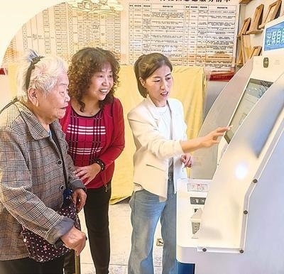 劉紅菊(右)幫助社區(qū)老人在社保自助終端辦理業(yè)務(wù)。本報記者 朱 磊攝