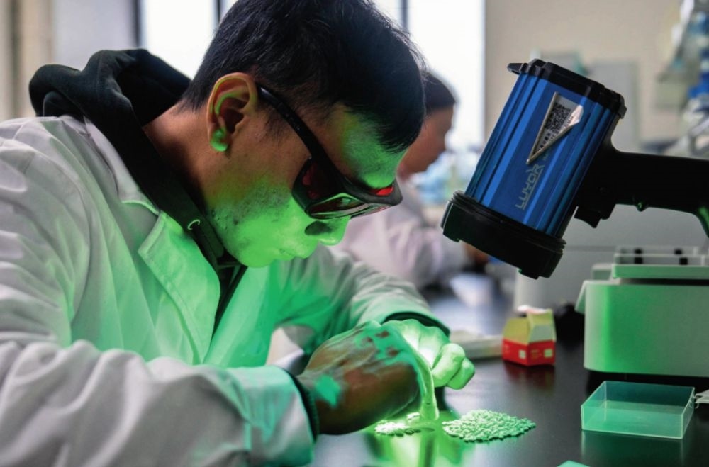 在湖南雜交水稻研究中心,工作人員通過熒光法進行水稻樣本分析(2024年11月25日攝)。陳思汗攝/本刊