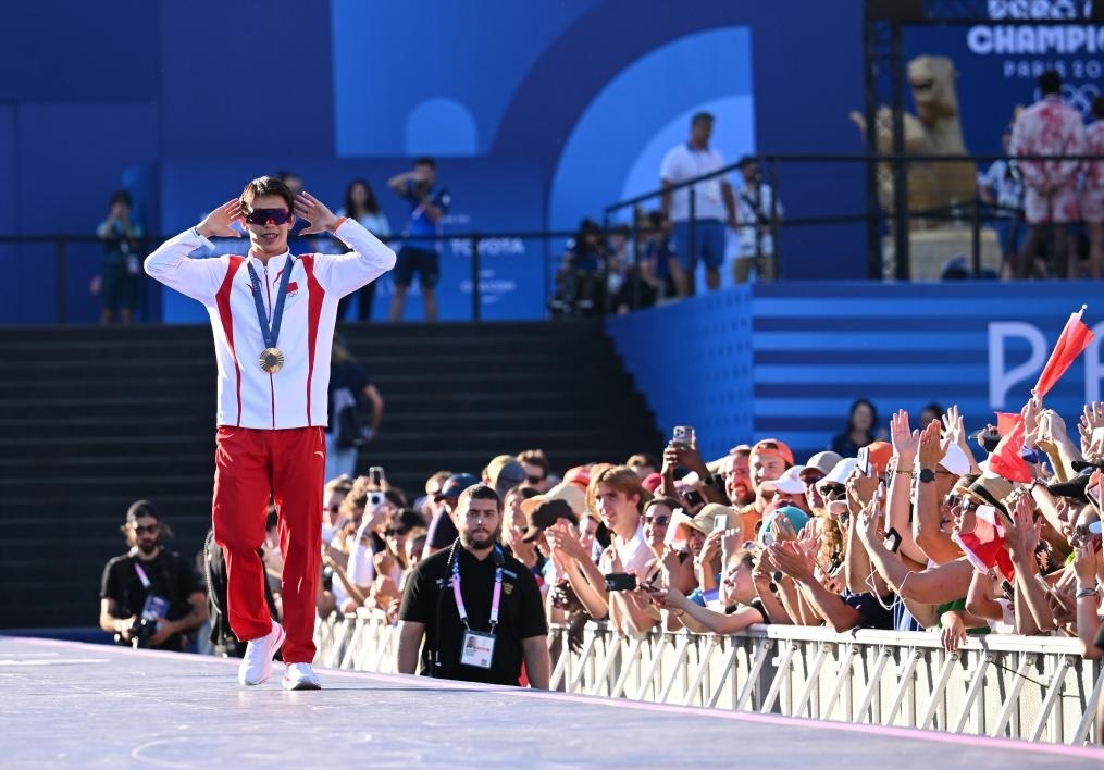 巴黎奧運(yùn)會(huì)跳水男子雙人三米板金牌得主、中國(guó)選手龍道一在法國(guó)巴黎冠軍公園與觀眾互動(dòng)(2024年8月5日攝)。新華社記者 賀燦鈴 攝