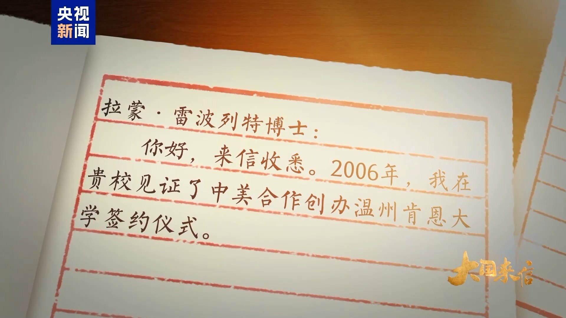 錦書云中來(lái),尺牘傳深情。2006年,時(shí)任浙江省委書記習(xí)近平在美國(guó)肯恩大學(xué)見證了中美合作創(chuàng)辦溫州肯恩大學(xué)的簽約儀式。自2014年設(shè)立以來(lái),溫州肯恩大學(xué)不僅培養(yǎng)了數(shù)千名中外學(xué)子,還推動(dòng)了中美兩國(guó)青年一代的友好交流。去年6月,習(xí)主席復(fù)信美國(guó)肯恩大學(xué)校長(zhǎng)拉蒙·雷波列特,鼓勵(lì)中美兩國(guó)高校加強(qiáng)交流合作,為促進(jìn)中美友好貢獻(xiàn)力量。