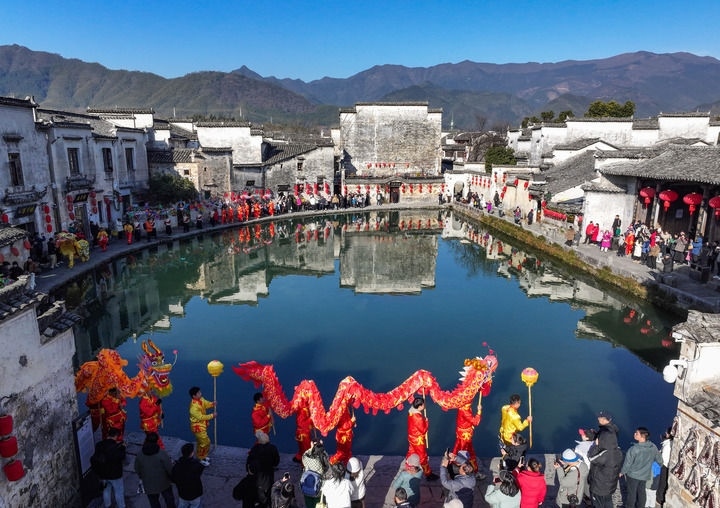 2025年1月18日,民俗表演隊(duì)在安徽省黃山市黟縣宏村巡游(無(wú)人機(jī)照片)。新華社發(fā)(施亞磊 攝)
