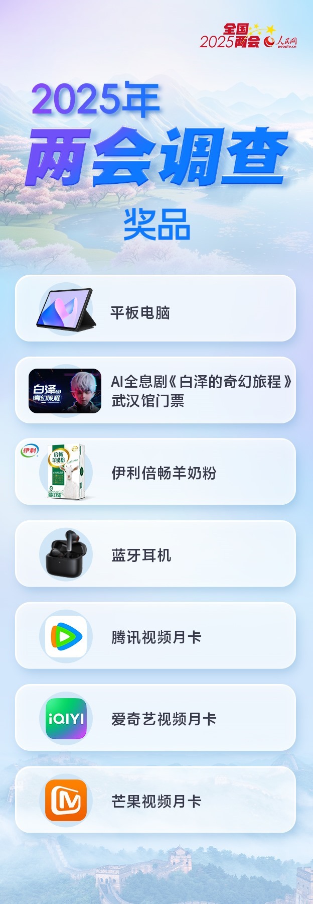 調(diào)查還在火熱進(jìn)行,各界可繼續(xù)通過人民網(wǎng)全媒體通道參與本次調(diào)查。為感謝網(wǎng)友對(duì)人民網(wǎng)2025年全國(guó)兩會(huì)調(diào)查的支持,參與者有機(jī)會(huì)抽取精美獎(jiǎng)品。