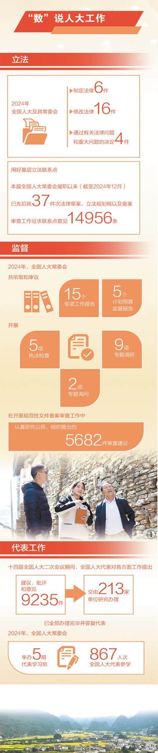 堅(jiān)持正確監(jiān)督、有效監(jiān)督、依法監(jiān)督,2024年全國(guó)人大常委會(huì)緊緊圍繞新時(shí)代黨和國(guó)家中心工作開(kāi)展監(jiān)督,聚焦推動(dòng)高質(zhì)量發(fā)展、增進(jìn)民生福祉、加強(qiáng)財(cái)政經(jīng)濟(jì)工作監(jiān)督等方面工作共聽(tīng)取和審議15個(gè)專項(xiàng)工作報(bào)告、5個(gè)計(jì)劃預(yù)算監(jiān)督報(bào)告,開(kāi)展5項(xiàng)執(zhí)法檢查、2項(xiàng)專題詢問(wèn)、9項(xiàng)專題調(diào)研,全年監(jiān)督項(xiàng)目均按照計(jì)劃要求依法有序開(kāi)展。