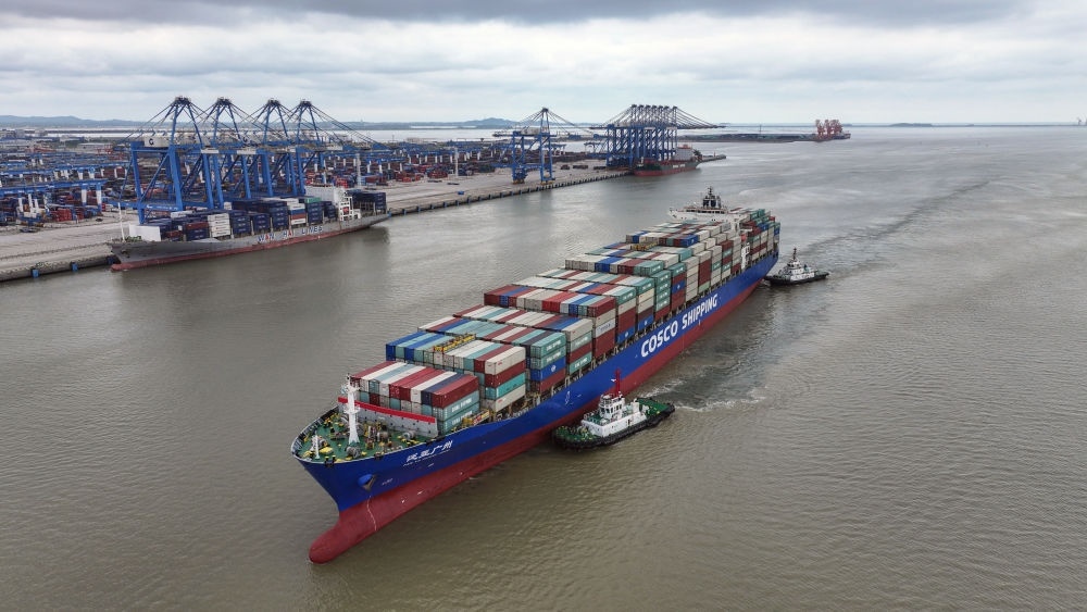 2024年5月19日,一艘海輪在廣西欽州港碼頭靠泊(無人機照片)。欽州港是北部灣港的組成部分,也是中國西南地區(qū)通往東盟的重要出???。西部陸海新通道利用鐵路、公路、水運等多種運輸方式,由重慶一路向南,經廣西北部灣出海通達世界各地。截至2025年1月1日,北部灣港總航線達80條,其中外貿航線49條,基本實現國內主要港口和東南亞、東北亞主要港口全覆蓋。